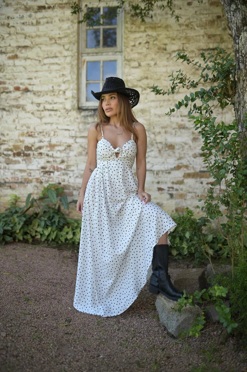Vestido ELOÁ: o vestido de alcinha que chegou para ser seu crush do verão 2026/27! Com estampa poá supertendência, ele valoriza e segura o seio com um decote delicado. O lastex atrás é o segredo para o ajuste perfeito, vestindo do 34 ao 40 como mágica. Leve, charmoso e prático — pronto para arrasar no calor com muito estilo e conforto!